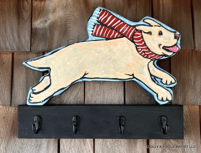 Leaping Winter Yellow Lab Folk Art Hook Rack